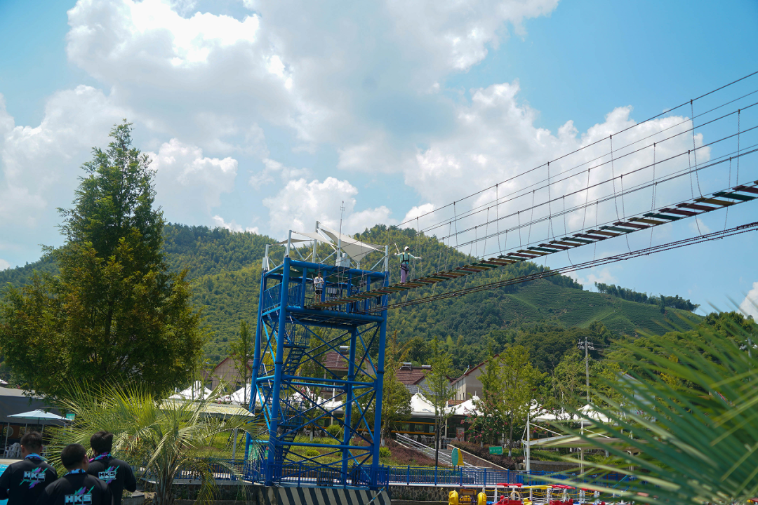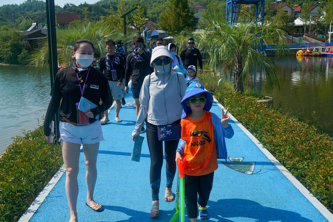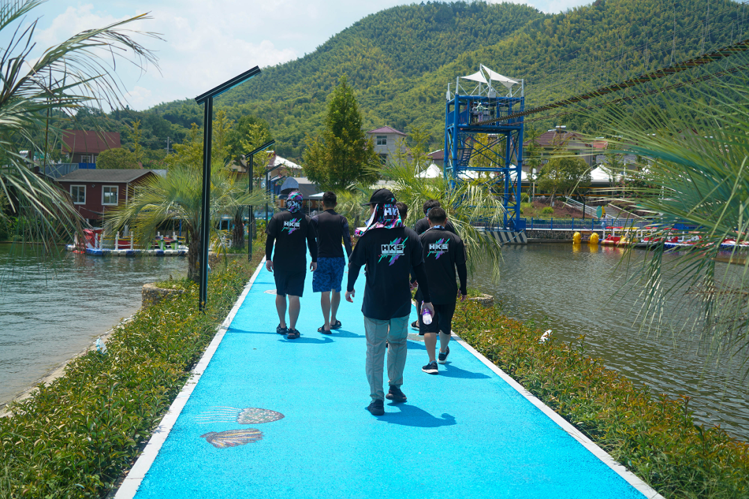 漂流结束后,前往下一个游玩点,穿着统一服装的HKS中国小伙伴一起穿过网红桥,形成了一道独特的风景线。