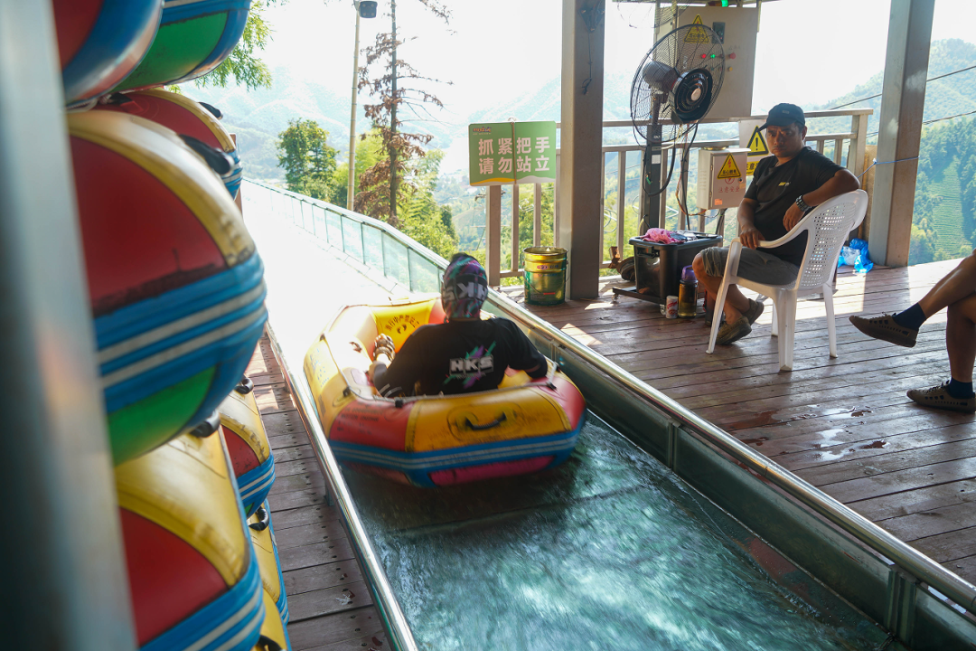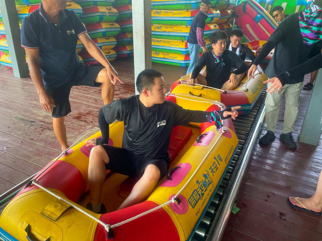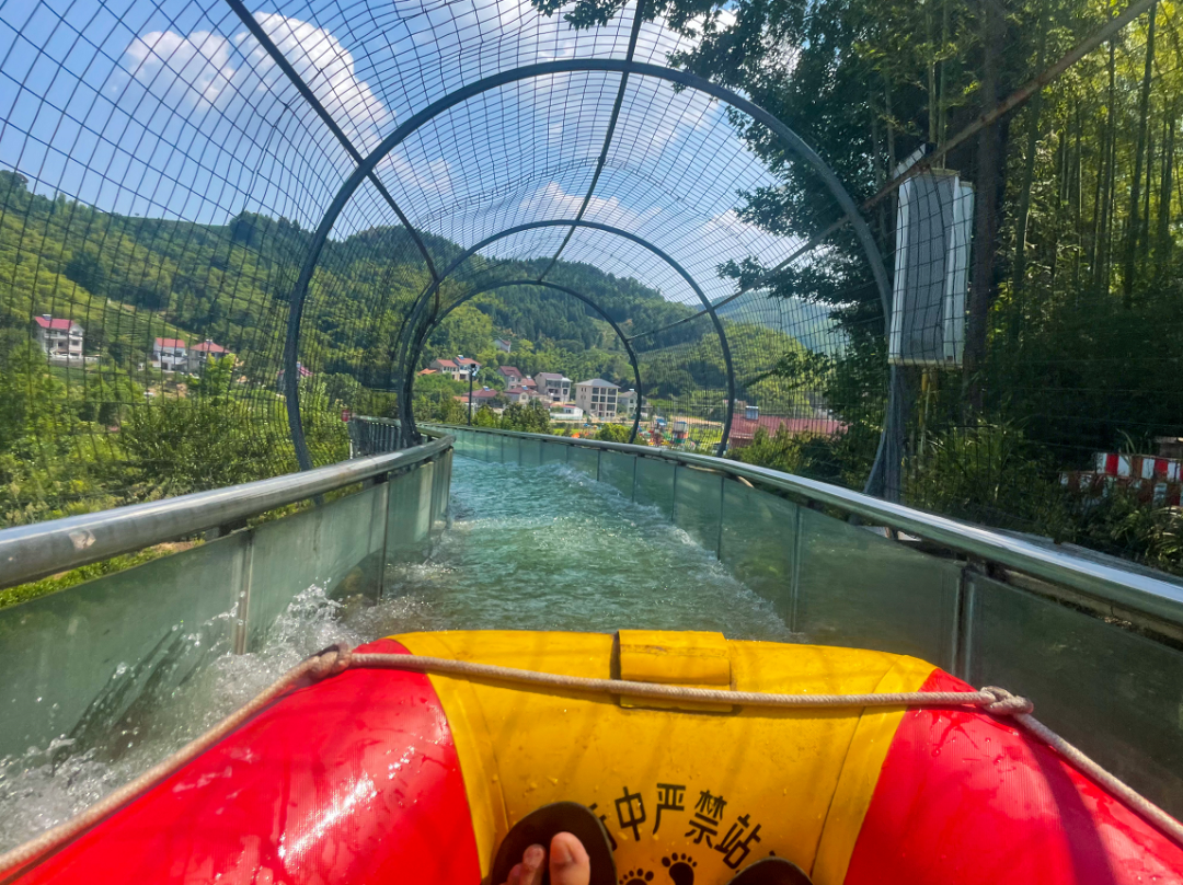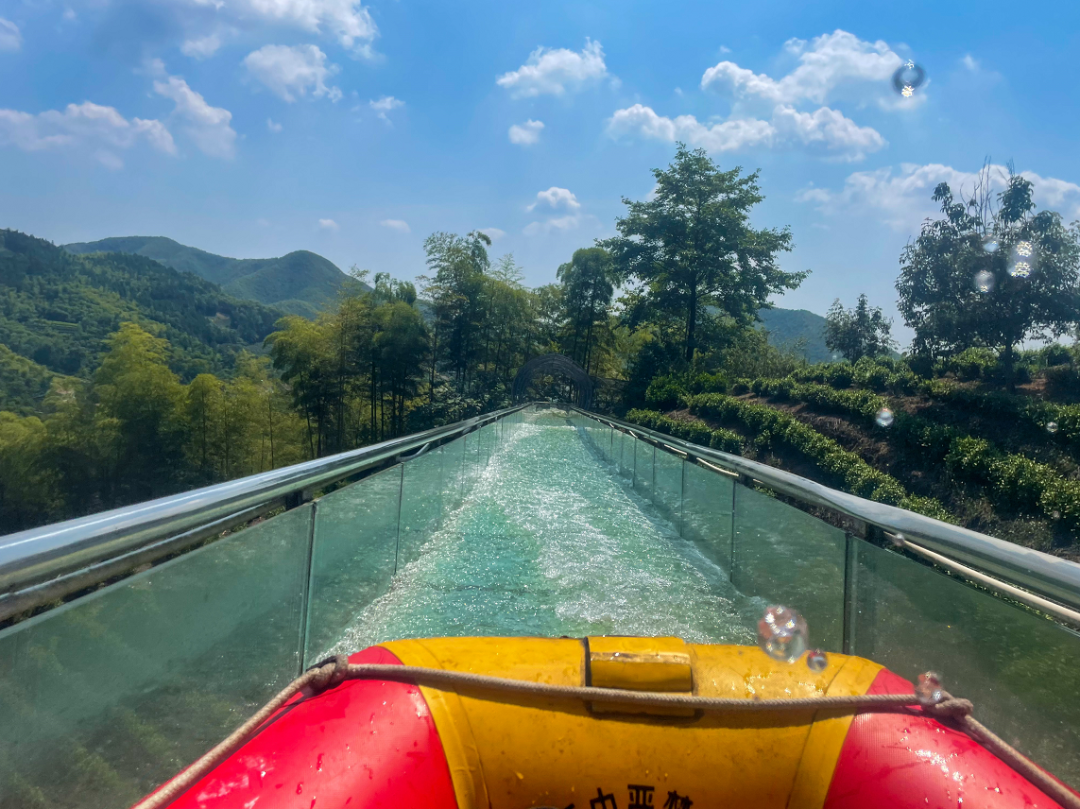大家2人一组乘坐皮艇向下冲刺,从透明的玻璃栈道上激流而下,迎接而来的是S型、U型、Z型及360度大回环弯道,每一次转弯都是水花四溅,满身的清凉,伴随着内心的忐忑,好刺激!
