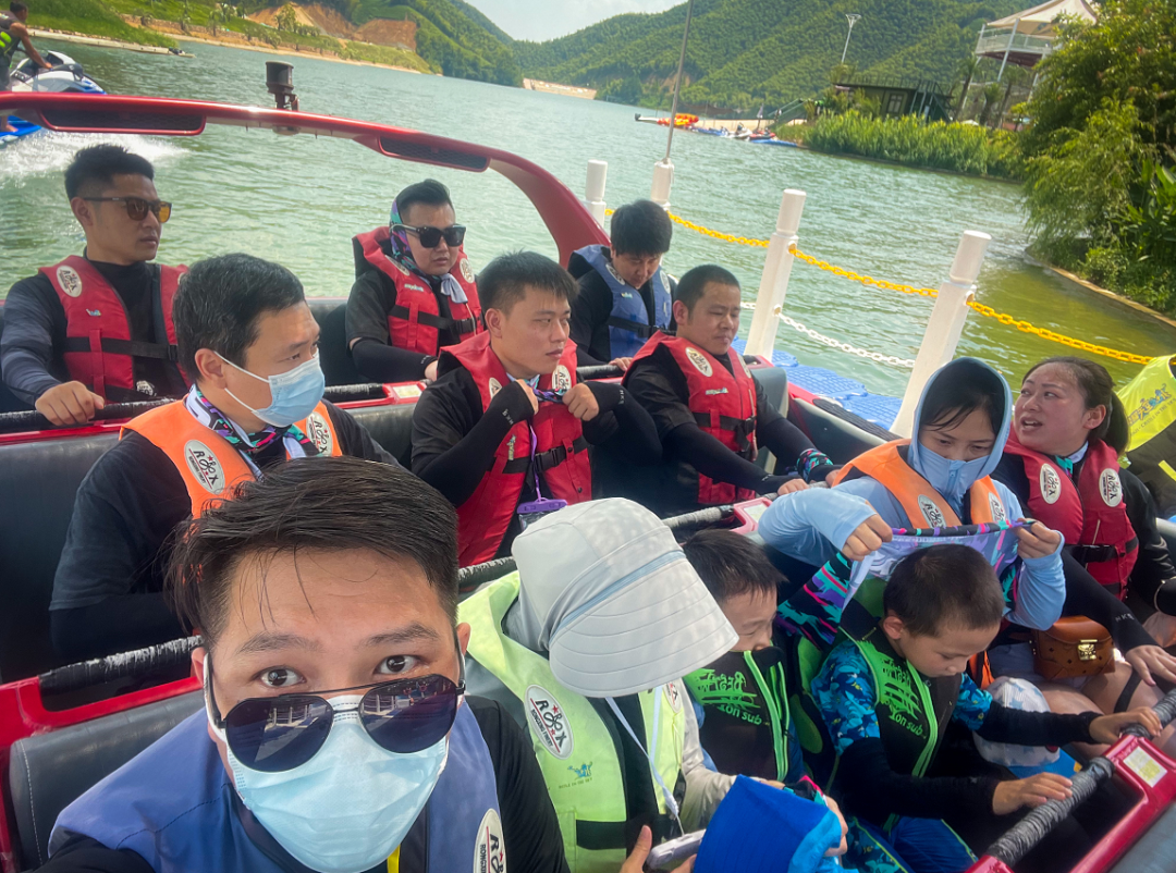 接下来是漂移艇项目,堪称“水上速度与激情”,在第一圈的“普通难度”之后,为了安全,驾驶员大哥贴心地请女士和小朋友先下船,留下成年男同胞体验了一把“超神难度”。