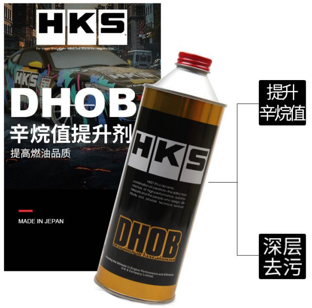 HKS在赛用汽油领域有丰富实战经验,在此基础上开发了汽油辛烷值提升剂(DHOB),每50L汽油添加1瓶DHOB,高标号汽油可以提升2个单位,普通汽油提升4-5个单位的辛烷值。在赛车竞赛等激烈的行驶条件下,或者汽油品质欠佳的地区,可以提高耐爆震性和安全性,并且对喷油嘴起到清洁作用。