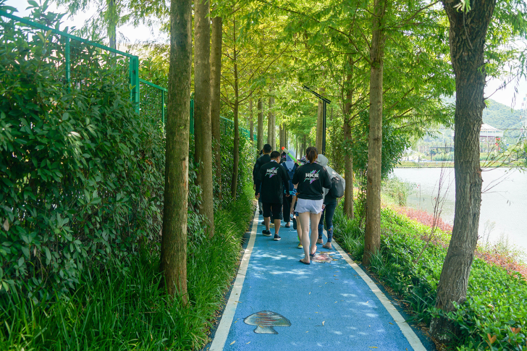 漂流结束后,前往下一个游玩点,穿着统一服装的HKS中国小伙伴一起穿过网红桥,形成了一道独特的风景线。