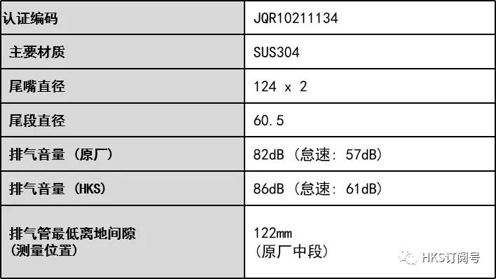 排气音量(HKS):86dB(怠速:61dB)