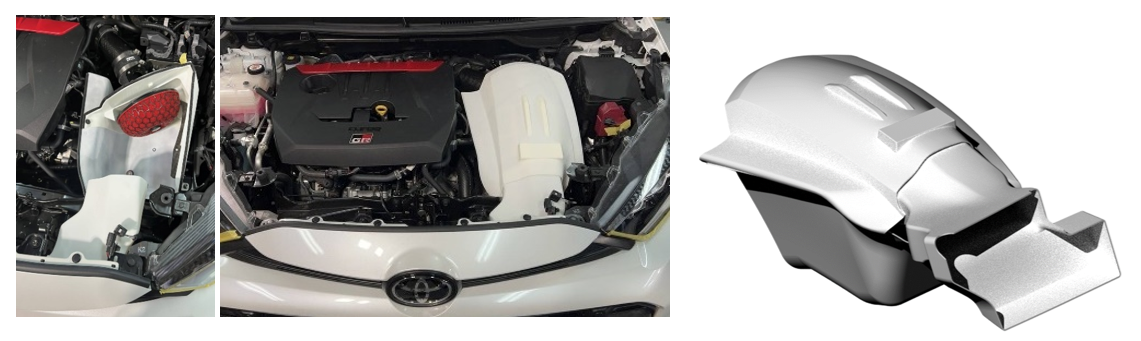 ●使用斜纹碳纤维,提升了发动机舱内的高级感。因为可以使用原厂车辆的安装固定点,避免了使用双面胶可能会造成的位置偏差等问题。
