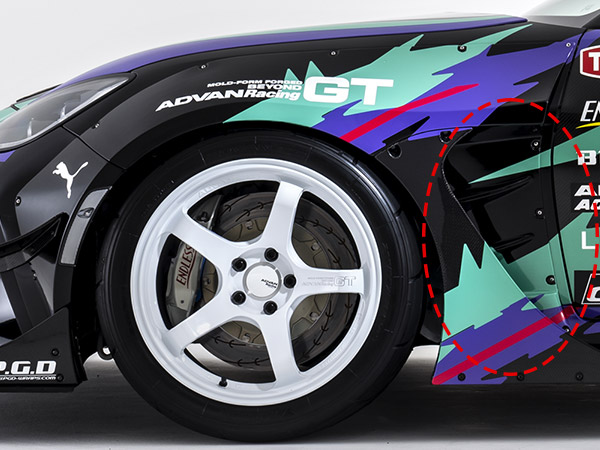 歴代タイムアタックマシンでの実績により、大型カーボン製カナードを採用。強力な縦渦を形成することで、低速域からでもタイヤハウス内の乱流を積極的に排出し、タイヤの接地感を向上させます。