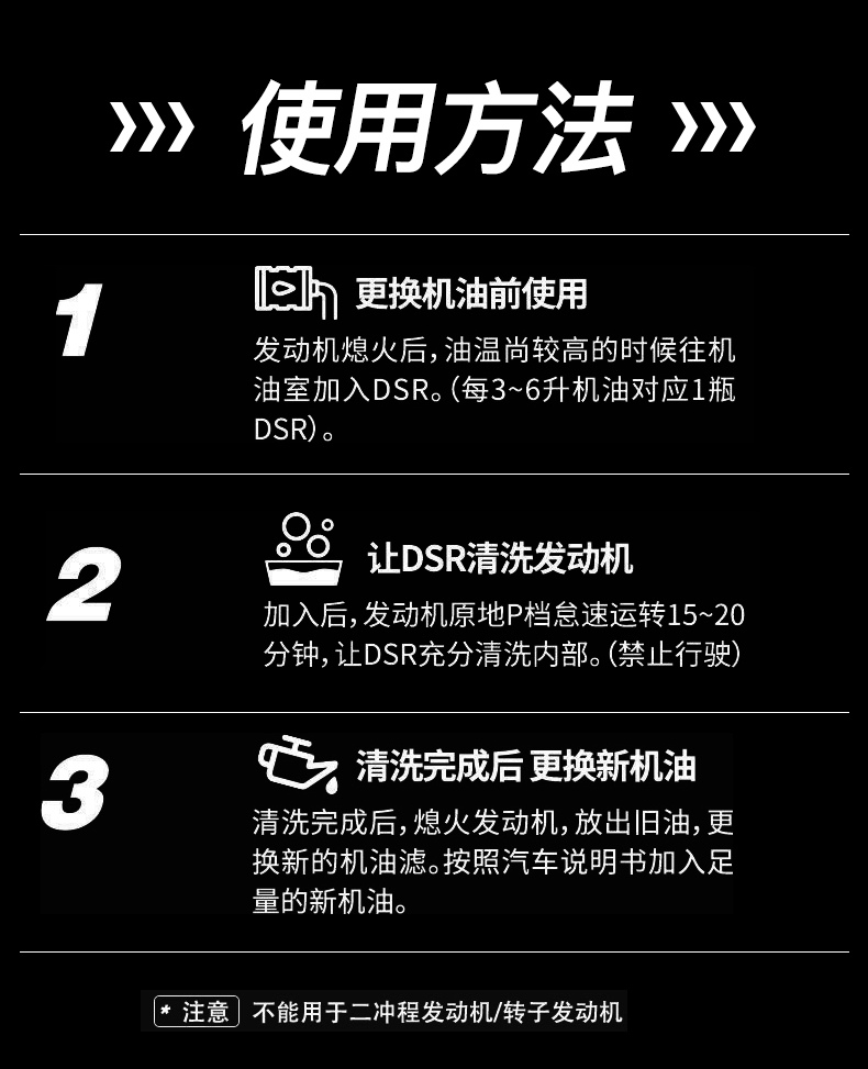 ①更换机油前关闭引擎,在机油未冷却时,每3L~6L加入一瓶本产品。